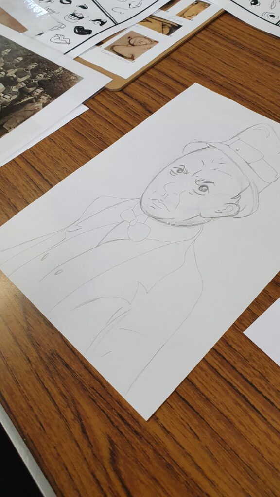 Cariacatures were the first theme.  There are the local residents ones from 100 years ago, and theatrical caricatures from 1896-1898.  The group studied these and then went on to draw their own … copied from works by Sidney Sime.