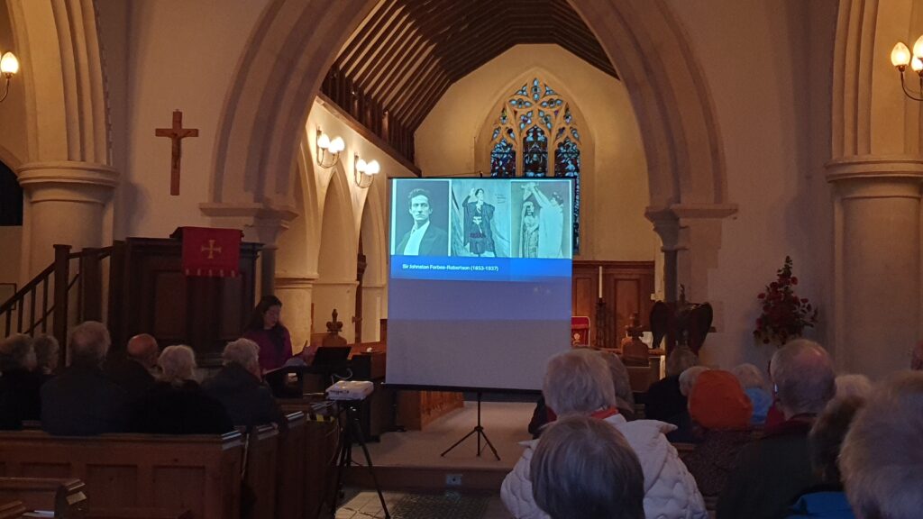 Carmen Holdsworth-Delgado enlightened 60 plus attendees to the Sime Gallery Annual Chris Ewbank Memorial lecture with an interesting and informative talk about the actor/ actresses and theatre managers of the Victorian/Edwardian era. This was held in St Mary’s Church Worplesdon. Sime drew those many stars of the era she spoke about for The Pick Me Up magazine under the weekly article Through the Opera Glass between 1896-1898 he did roughly 394 theatrical caricatures as well as for the Tatler magazine in the early 1900s. The Sime Gallery have 213 original artworks.